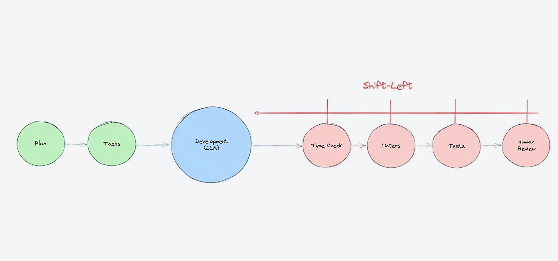 Instead, we should give it several self-check stages along the way, so it can validate its own progress, regulate its own path, and avoid producing low-quality code that we later have to fix by hand. And if an error is found at any of those stages, we move left again – back to development – fix the issue, and then try to pass all the stages again from the updated state.